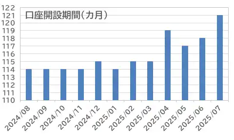 取引をしたFX投資家の口座開設後の期間は、平均121カ月(10年1カ月)と、前月の118カ月から拡大した。 |