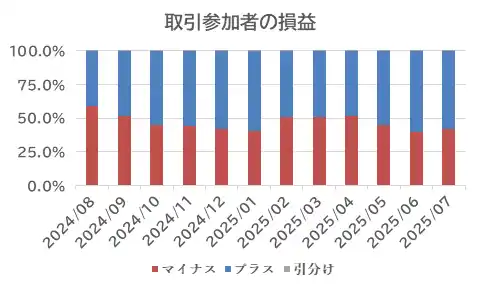7月のFX取引において実現益を出した投資家の割合は58.1%と、6月の60.0%から低下した。一方で、実現損を出した投資家の割合は41.8%と、6月の39.9%から小幅に上昇した。その他の投資家は収支がゼロだった。米国の関税策、FRBの年内利下げを巡る思惑、本邦の政局が交錯して見通しへの不確実性は残ったものの、世界的な株価安定を受けたJPY(円)安進行で、6月にJPY(円)売りポジションを構築していた投資家の利食いが優勢となった。 |