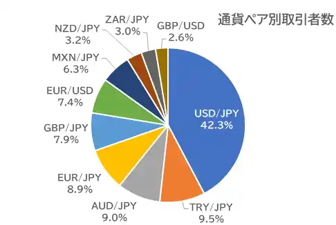 通貨ペア別取引者数のトップ10は、USD/JPY(米ドル/円)・TRY/JPY(トルコリラ/円)・AUD/JPY(豪ドル/円)・EUR/JPY(ユーロ/円)・GBP/JPY(ポンド/円)・EUR/USD(ユーロ/米ドル)・MXN/JPY(メキシコペソ/円)・NZD/JPY(NZドル/円)・ZAR/JPY(南アフリカランド/円)・GBP/USD(ポンド/米ドル)の順で、順位の入れ替わりはなかった。 |