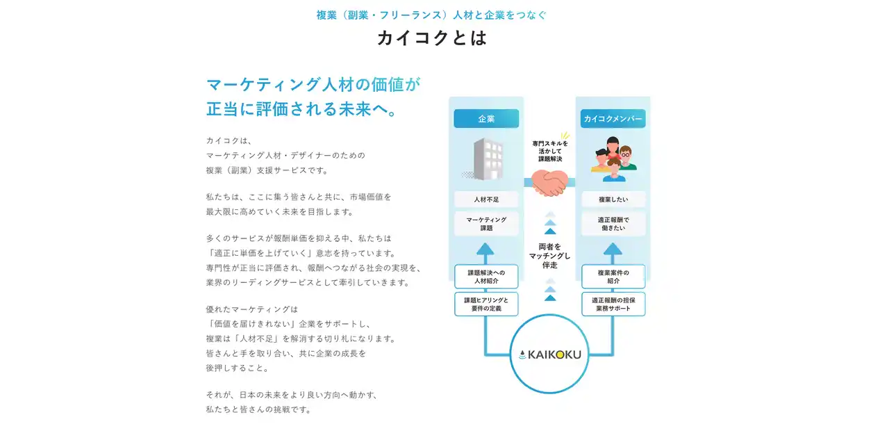 「メンバーの声」の充実: 実際にカイコクで活躍する複業人材のリアルな成功事例を多数掲載し、利用者の共感を醸成します。 |