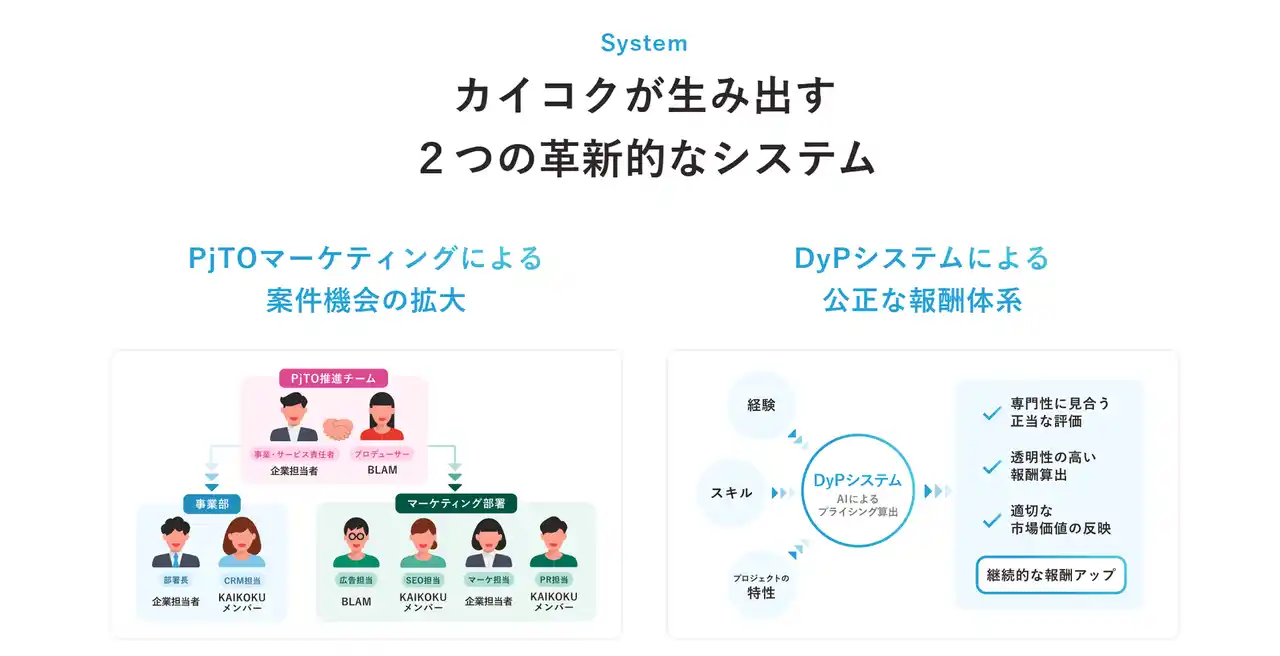 今回のリニューアルでは、BLAMが掲げる「未来につながるハタラクを創る」というビジョンをより鮮明に伝えるとともに、マーケティング業界の課題解決に向けた当社独自のソリューションである「PjTOマーケティング」と、AIを活用した公正な報酬算出システム「DyP(ダイナミックプライシング)」を前面に打ち出し、サービスの提供価値を再定義します。 |