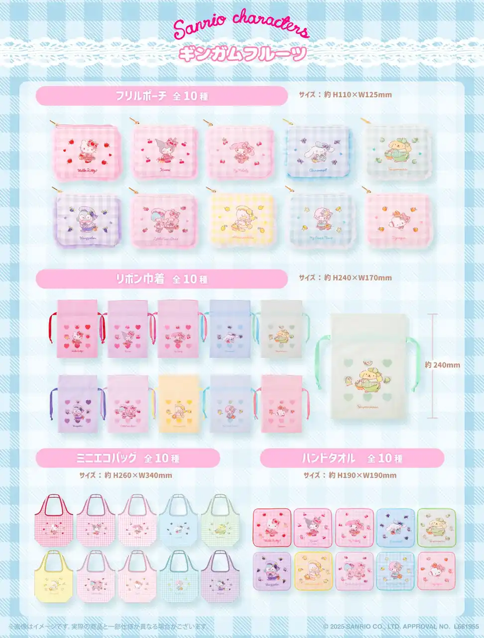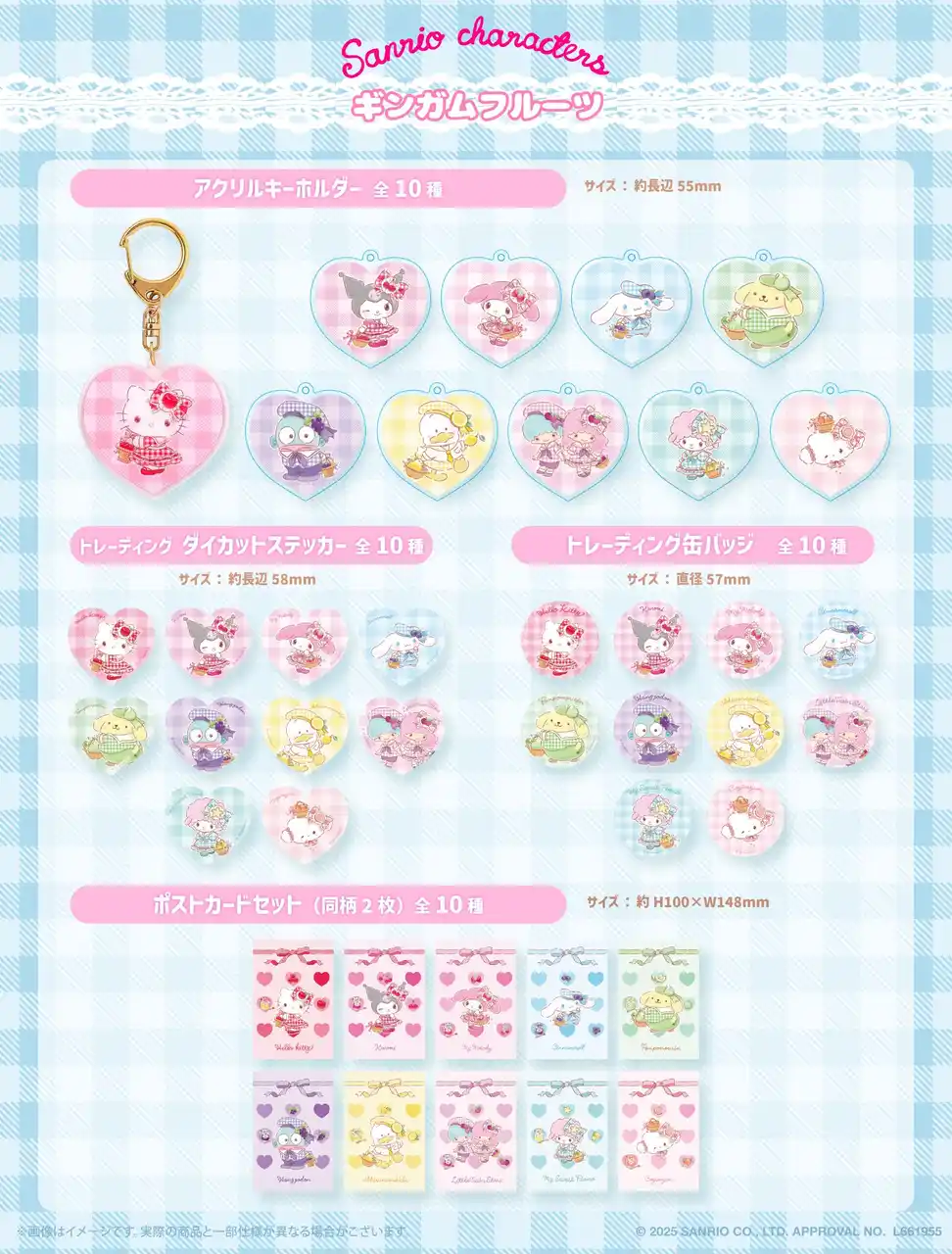 キャラクターラインナップ(全10種):ハローキティ・クロミ・マイメロディ・シナモロール・ポムポムプリン・ハンギョドン・あひるのペックル・こぎみゅん・リトルツインスターズ(キキ/ララ)・マイスウィートピアノ |