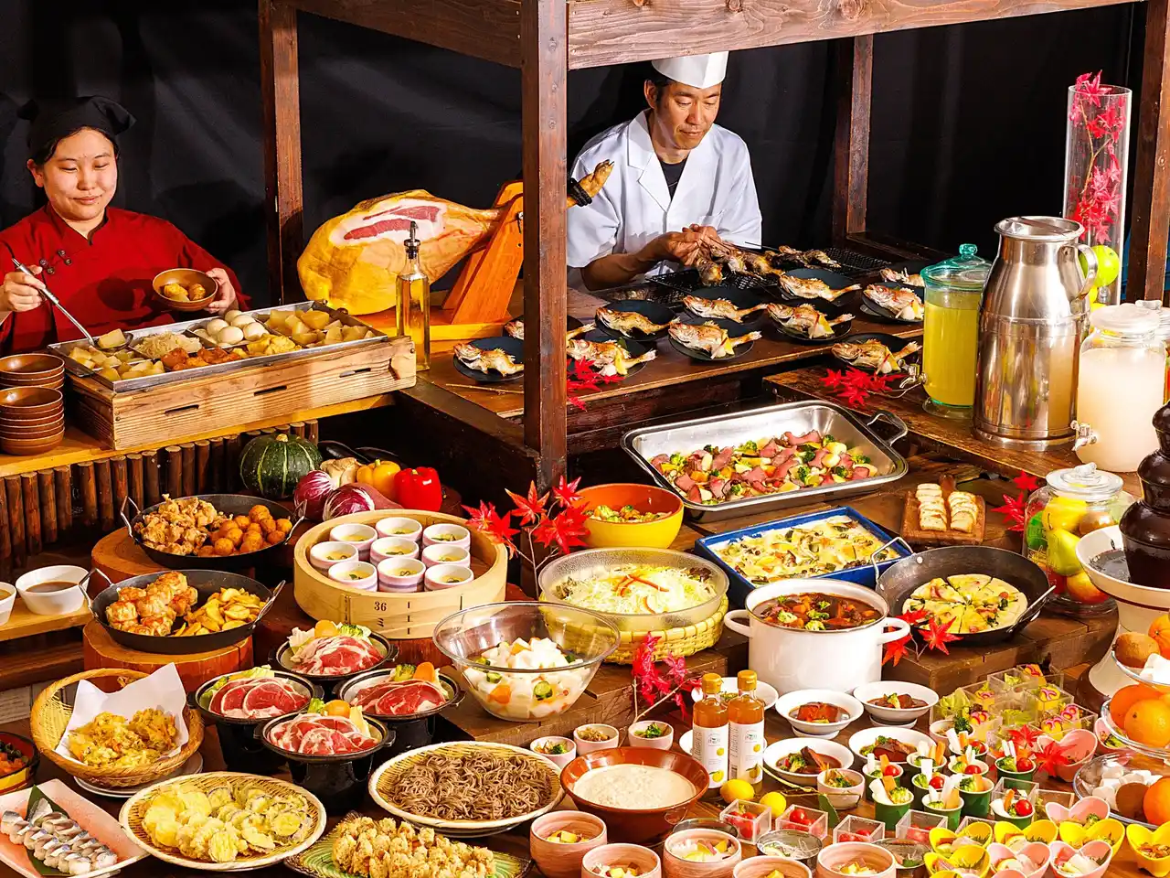 秋のひるぜん高原ビュッフェでは、蒜山高原の土「黒ボコ」で育ったブランド大根のおでんをはじめ、ご当地グルメや地元食材にこだわった料理をご用意します。さらに、秋限定で、旬を迎え脂がのった高級のどぐろ塩焼きのワンプレートサービスも付き、一層贅沢なビュッフェです。 |