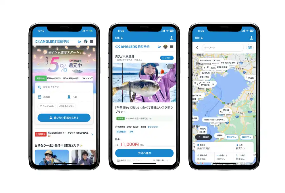 釣りアプリ「ANGLERS(アングラーズ)」の情報を活用し、釣船やチャーターボート、渡船の予約がスマホで簡単にできるサービスです。釣りアプリ「ANGLERS」は17秒に1回釣果が投稿される釣り専用のSNSです。月間100万人以上のユーザーが訪れ、釣果情報の投稿や、釣り情報のコミュニケーションの場として活用されています。 |