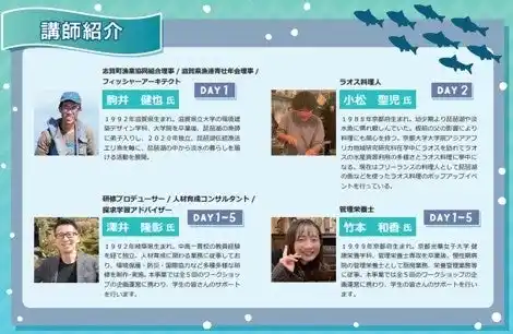 <1日目>9月20日(土)9:30~14:30 ・琵琶湖で漁体験を実施。琵琶湖の魚の魅力を知ろう <2日目>10月12日(日)13:00~17:00 ・ラオス料理人直伝!魚の色々な調理方法を知ろう <3日目>11月1日(土)13:00~17:00 ・管理栄養士さんにアドバイスを頂きながら、 実際にレシピを開発しよう(1回目) <4日目>11月15日(土)13:00~17:00 ・実際にレシピを開発しよう(2回目) <5日目>11月29日(土)13:00~17:00 ・考えたレシピを実際に調理してみよう!レシピカードを作ろう! |