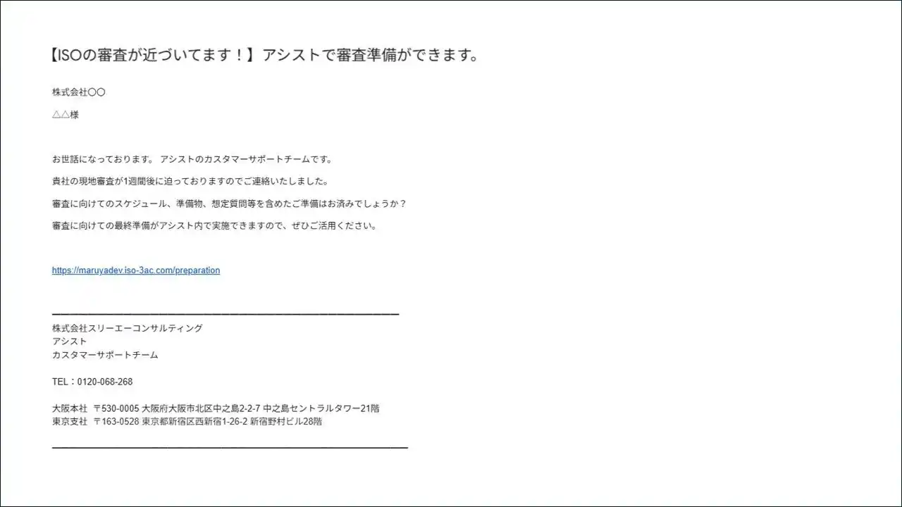 Pマーク、 ISOコンサルにおける支援実績 No.1(注1)のISO/Pマークの取得・運用支援サービス「認証パートナー」を提供する株式会社スリーエーコンサルティング(本社:大阪府大阪市、代表取締役社長:竹嶋 寛人)は、このたび、当社が提供するクラウド型ISO管理ツール『ISMSアシスト』『9001アシスト』『14001アシスト』において、「審査前連絡」機能の拡充およびアップデートを実施いたしました。今回のアップデートにより、審査の1週間前および前日に自動で通知が届くようになり、審査日をうっかり失念することなく、確実に準備を進めていただける環境を整えました。 |