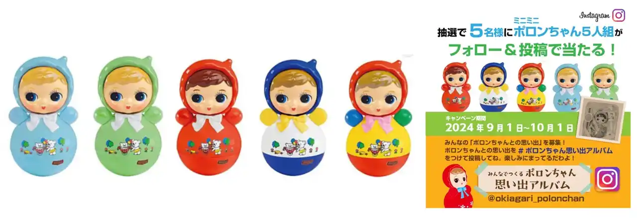 ポロンちゃんの公式インスタグラムでは、「みんなで作るポロンちゃん思い出アルバム」と題して、みなさんから広くポロンちゃんとの思い出を募集するフォロー&投稿キャンペーンも開催。ポロンちゃん公式アカウント「https://www.instagram.com/okiagari_polonchan(@okiagari_polonchan)」をフォローの上、ポロンちゃんとの思い出をハッシュタグ「#ポロンちゃん思い出アルバム」をつけて昔の写真や今のポロンちゃんとの思い出を投稿すると、投稿くださった方の中から抽選で、ポロンちゃんミニミニトイ5体セット(色は選べません)をプレゼントします。 |