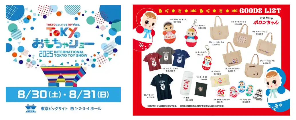 8月28日(木)から31日(日)に、東京ビッグサイト(西1~4ホール)にて開催される、日本最大級の玩具イベント「東京おもちゃショー」で、65周年記念ソフビの初お披露目を行うとともに、会場限定100個を先行販売します。トイローヤルブース内に、「おもちゃからIPへ」新たな進化を遂げたポロンちゃんの特設ミニブースも用意します。 |