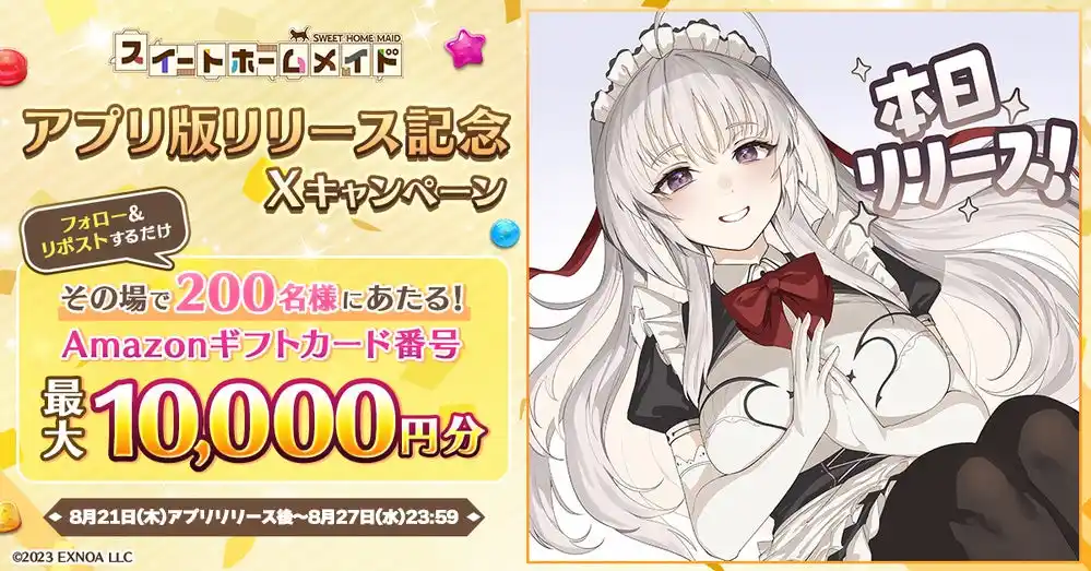 アプリ版スイートホームメイドのリリースを記念して、フォロー&リポストでAmazonギフトカード番号が最大10,000円分その場で200名様にあたるキャンペーンを開催いたします! |