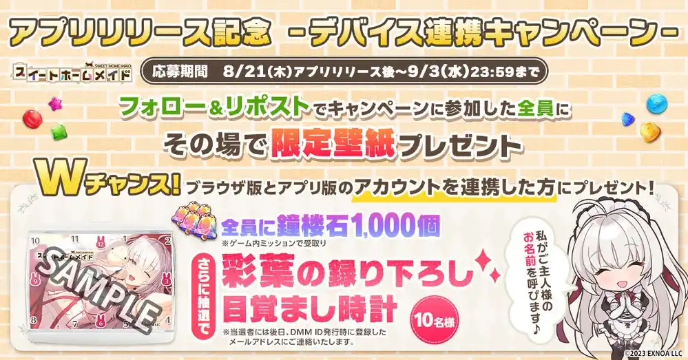 合同会社EXNOA(本社:東京都港区、CEO:村中 悠介、URL:https://games.dmm.com/)が運営するDMM GAMESにおいて、アプリ版『スイートホームメイド』の正式リリースが開始したことをお知らせいたします。また、オリジナルグッズやAmazonギフトカード番号がその場で当たるキャンペーンを開催いたします。 |