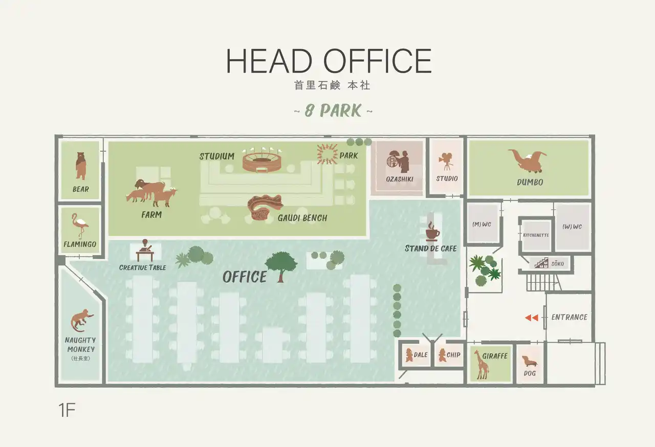 さらにオフィス内は、本社や工房を動物たちも暮らす8つの公園( 8 PARK)に見立てたレイアウトにしました。未来の「世界の人が笑顔になる村」構想からイメージしています。 |