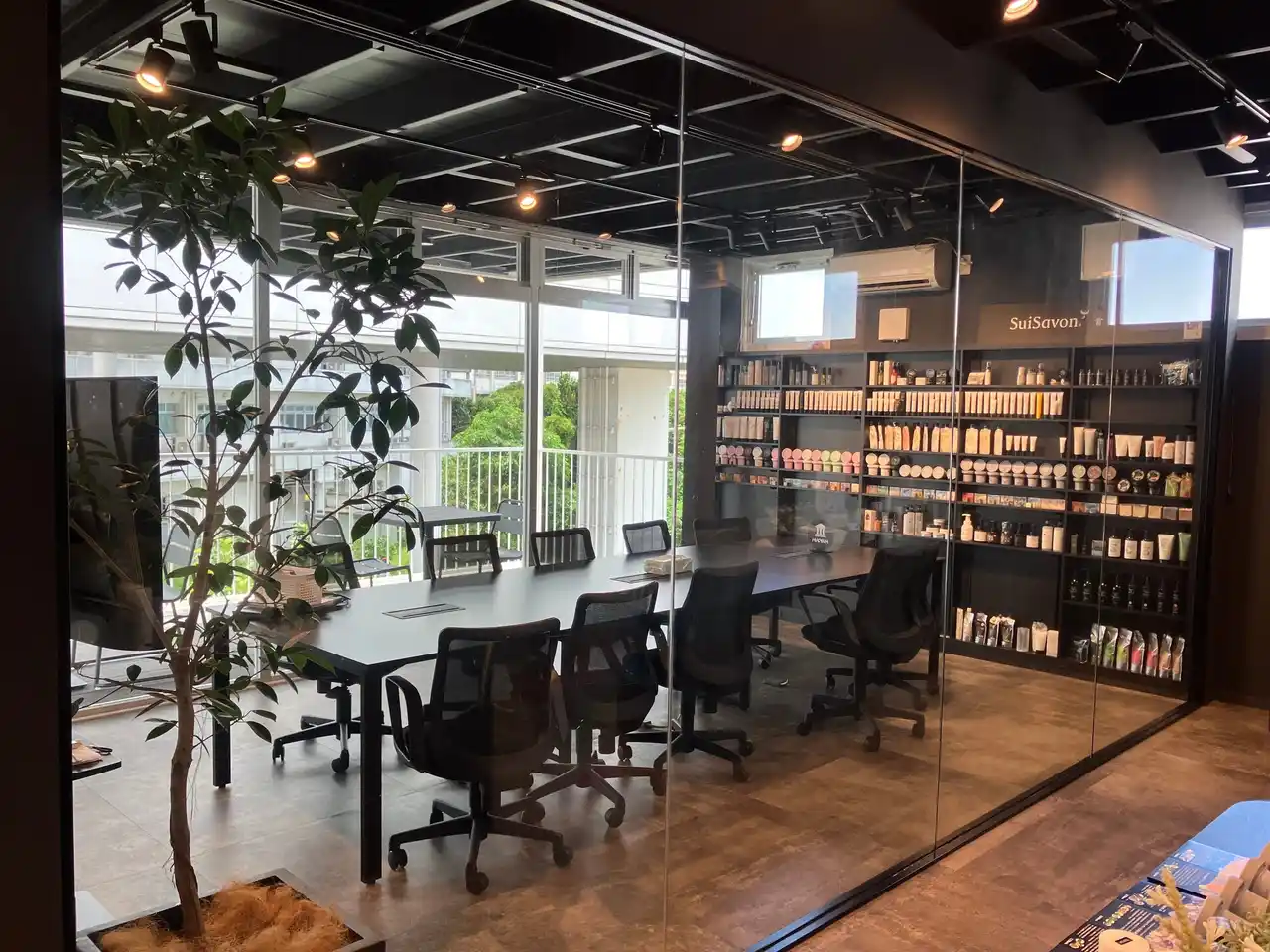 ミーティングスペース(PANDA) 首里石鹸の歴代商品が並び、研修や商品開発会議を実施するスペース。 |