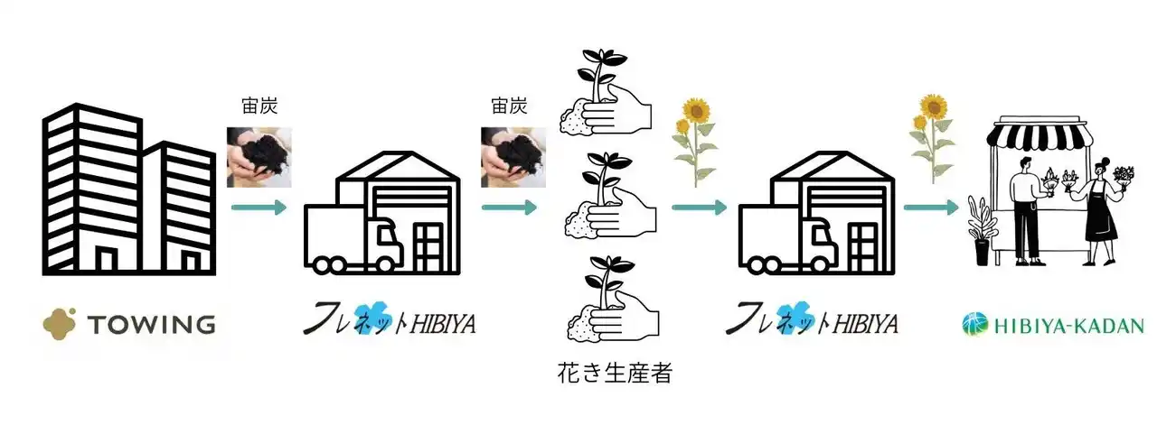 株式会社TOWING(本社:愛知県名古屋市、代表取締役CEO:西田宏平、以下「TOWING」)と株式会社日比谷花壇(本社:東京都港区、代表取締役社長:宮島浩彰、以下「日比谷花壇」)は、2025年8月8日(金)に、持続可能な花き生産に向けて業務提携を締結しました。TOWINGが開発した高機能バイオ炭「宙炭(そらたん)※」を、日比谷花壇グループの株式会社フレネットHIBIYA(本社:東京都港区、代表取締役社長:緒方優夫、以下「フレネットHIBIYA」)を通じて花き生産者へ販売し、温室効果ガスの削減と炭素貯留の実現とともに、花きサプライチェーン全体における脱炭素化を推進していきます。