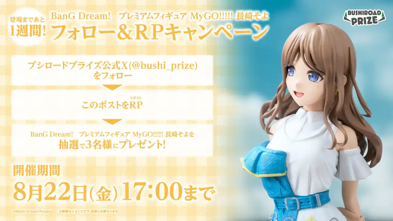 株式会社ブシロード(本社:東京都中野区、代表取締役社長:木谷高明)のグループ会社にあたる株式会社ブシロードクリエイティブ(本社:東京都中野区、代表取締役社長:成田耕祐)は、「BanG Dream! プレミアムフィギュア MyGO!!!!! 長崎そよ」を2025年8月22日(金)から全国のゲームセンターに順次展開いたします。 |