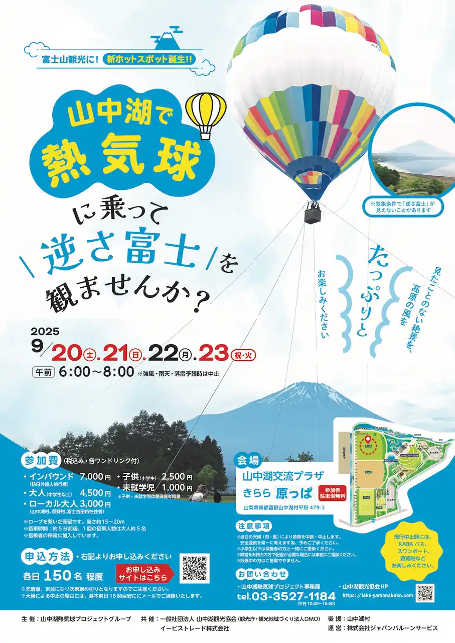 | 2025年9月、山中湖に新たな観光アクティビティが誕生します。イービストレード株式会社(本社:東京都千代田区、代表取締役:寺井良治)を中心とする山中湖熱気球プロジェクトグループは、山梨県南都留郡の山中湖交流プラザきらら原っぱゾーンにて熱気球体験事業をスタートします。第一回は9月20日(土)~9月23日(火・祝)の午前6時~8時の限定開催。富士山と湖に映る“逆さ富士”を空から楽しめる新しい観光スポットとして、若年層やファミリー層、訪日外国人旅行者まで幅広い世代に楽しんでいただけます。自然にもやさしいサステナブルな体験型観光として、地方創生・観光振興の新しい一歩を目指します。 | |||||||||