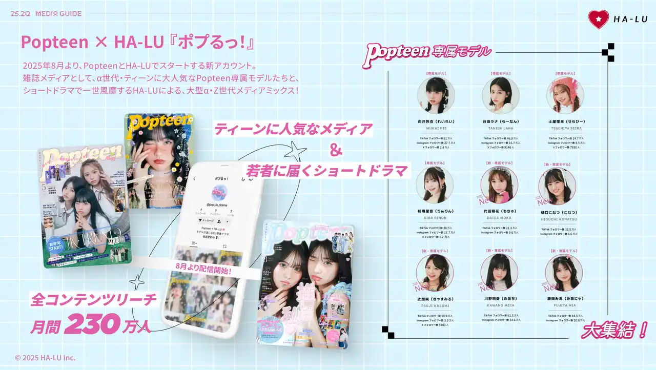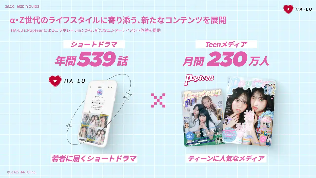 本協業は、α・Z世代への高いリーチ力とブランド力を持つ『Popteen』と、ショートドラマ制作・SNSマーケティングに強みを持つHA-LUの知見を掛け合わせ、α・Z世代に向けたコンテンツを企画から制作・発信までワンストップでプロデュースし、新たなエンタメ体験を創出することを目指します。 |