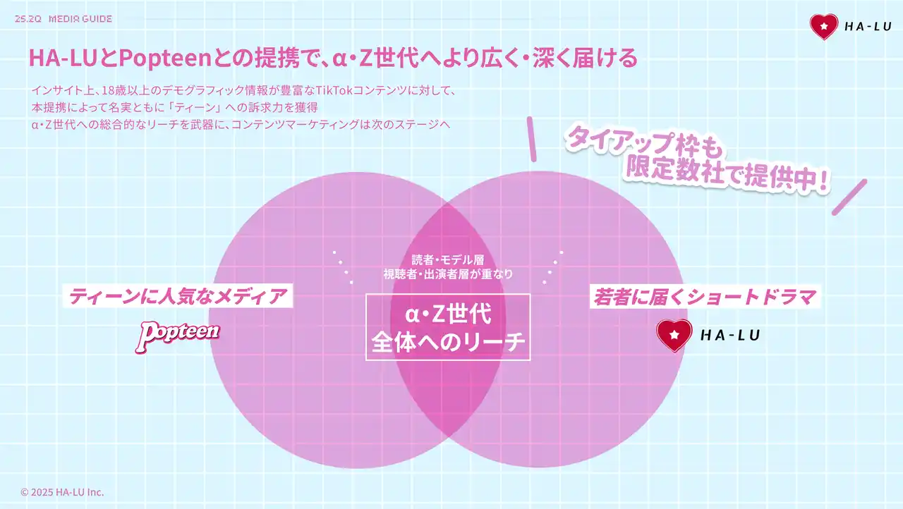 数分で心が夢中になるショートドラマレーベル、株式会社HA-LU(本社:東京都港区、代表取締役:岡 春翔、以下「HA-LU」)と、ティーン向けWEBメディア『Popteen』を運営する株式会社ポップティーン(本社:東京都中央区、代表取締役:大島 正人、以下「ポップティーン」)は、コンテンツ制作における協業を開始しました。 |