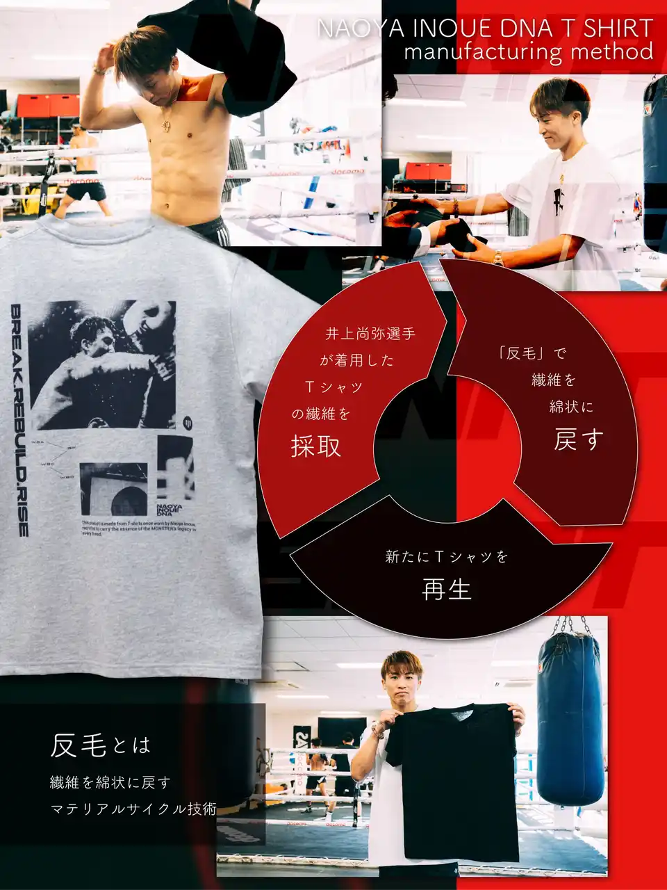 マテリアルリサイクル技術(繊維を機械で綿状に戻す反毛技術)を活用し、井上選手の練習拠点である横浜市に所在する「大橋ボクシングジム」と連携して制作された、特別な一枚です。 |