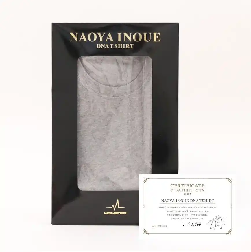 数量限定で製作された本品には、一点ものであることを証明するシリアルナンバーと、井上尚弥選手のサインが刻印された証明書が付属します。 |