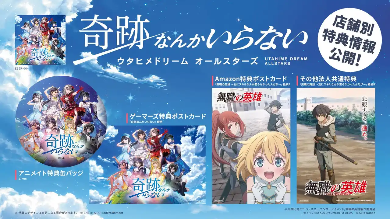 | 株式会社アース・スター エンターテイメント(本社:東京都品川区、代表取締役社長:幕内和博)に所属するアーティスト『花耶(かや)』が歌う新曲「Reincarnation」(TVアニメ『無職の英雄 ~別にスキルなんか要らなかったんだが~』オープニングテーマ曲)、および同社が展開するメディアミックス音楽プロジェクト「ウタヒメドリーム」から『ウタヒメドリーム オールスターズ』が歌う新曲「奇跡なんかいらない」(TVアニメ『無職の英雄 ~別にスキルなんか要らなかったんだが~』エンディングテーマ曲)の予約受付を開始いたしました。 | |||||||||||||||||
