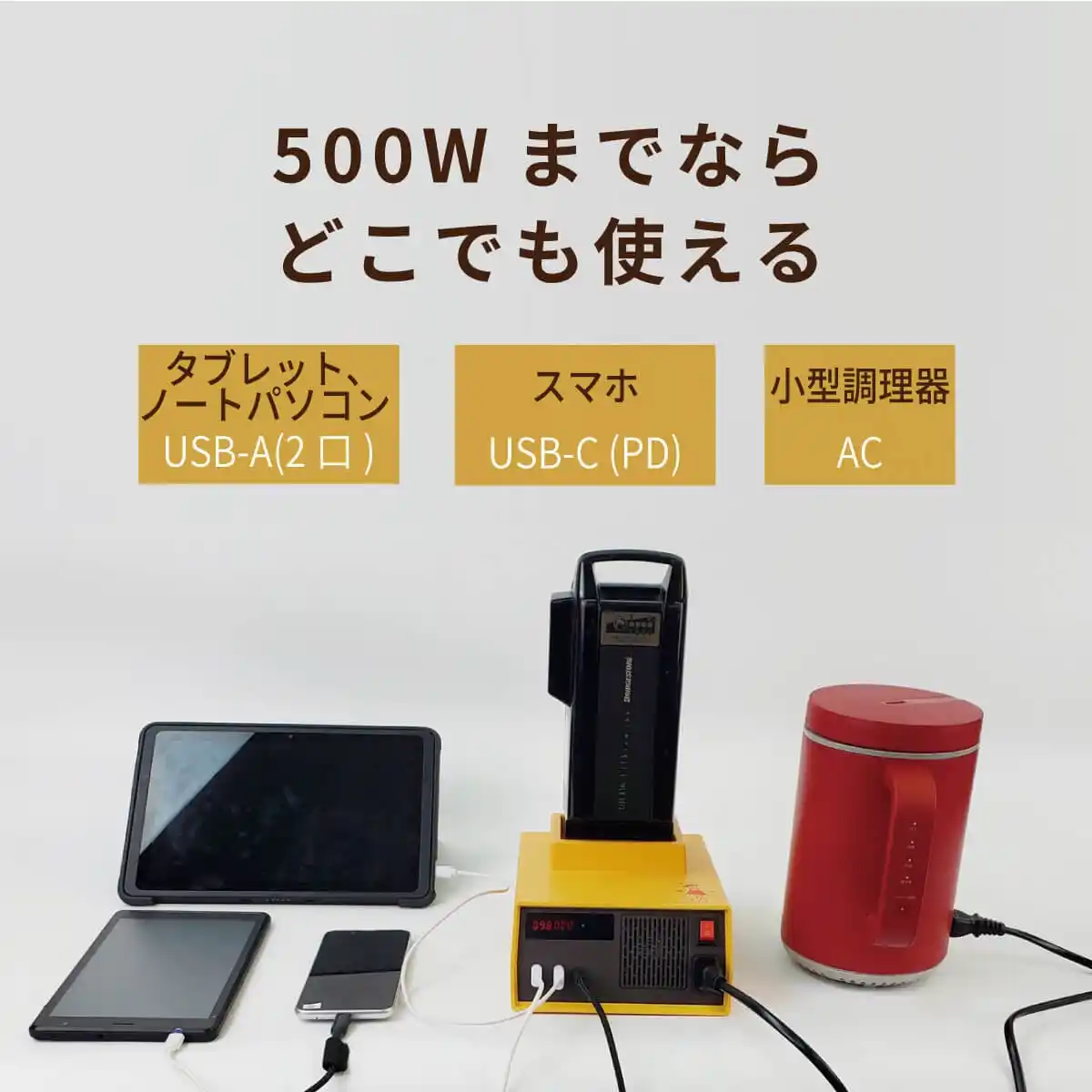 ・定格出力500W ・AC出力/Type-Cポート×1/USBポート×2 ・防災製品等推奨品マーク取得 ・パナソニック、ブリヂストン、ヤマハの25.2~25.9Vバッテリーに対応 |