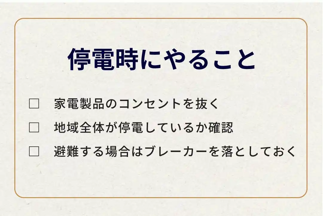 台風や落雷時に突然停電! そんなときは焦ってしまいますが、雨水などが原因で漏電ブレーカーが落ちることは珍しくありません。自宅だけが停電している可能性も十分にあるため、近所一帯を見渡し、自宅の分電盤も確認してください。以下のチェック項目も忘れずに! |