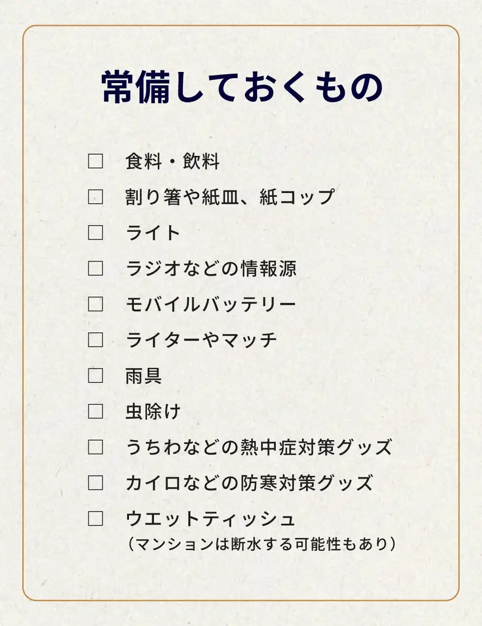 停電はいつ復旧するかわかりません。常に必需品をまとめておくことも重要です。ぜひ常備リストも参考にしてください。 |