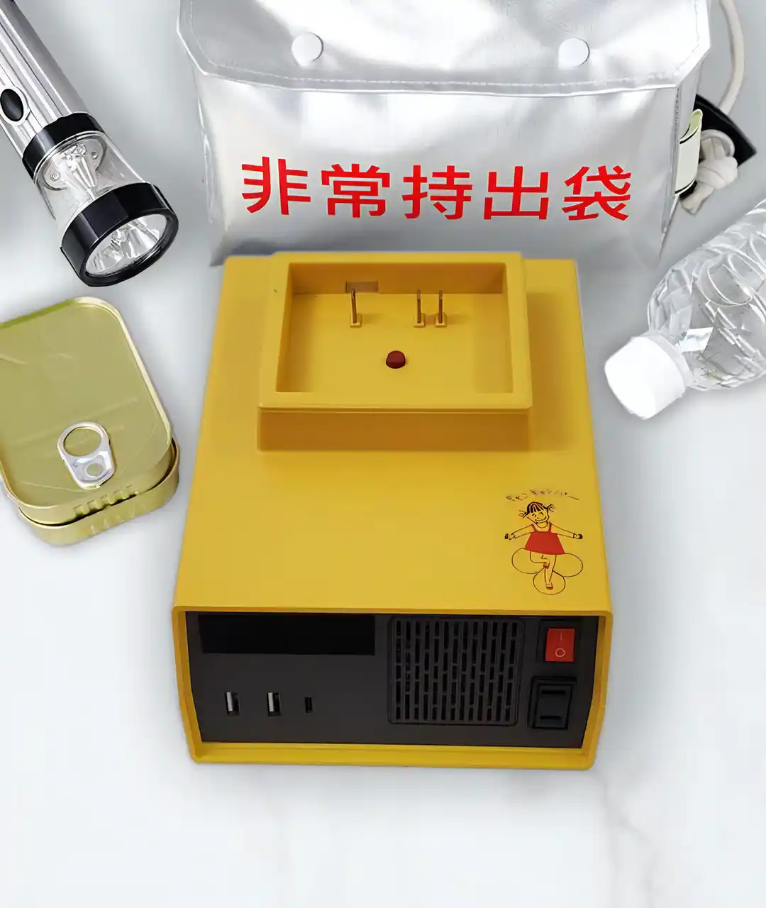 コンセントがない場所や停電時も給電できるインバーター「チャリパワー」は防災グッズとしてもおすすめ。 |