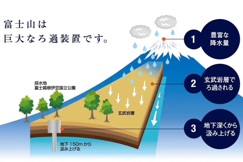 富士山の玄武岩層で自然ろ過された後、加熱処理で不純物のみを取り除くため、バナジウムやシリカなどの希少な天然ミネラルをバランスよく含んでいます。 |
