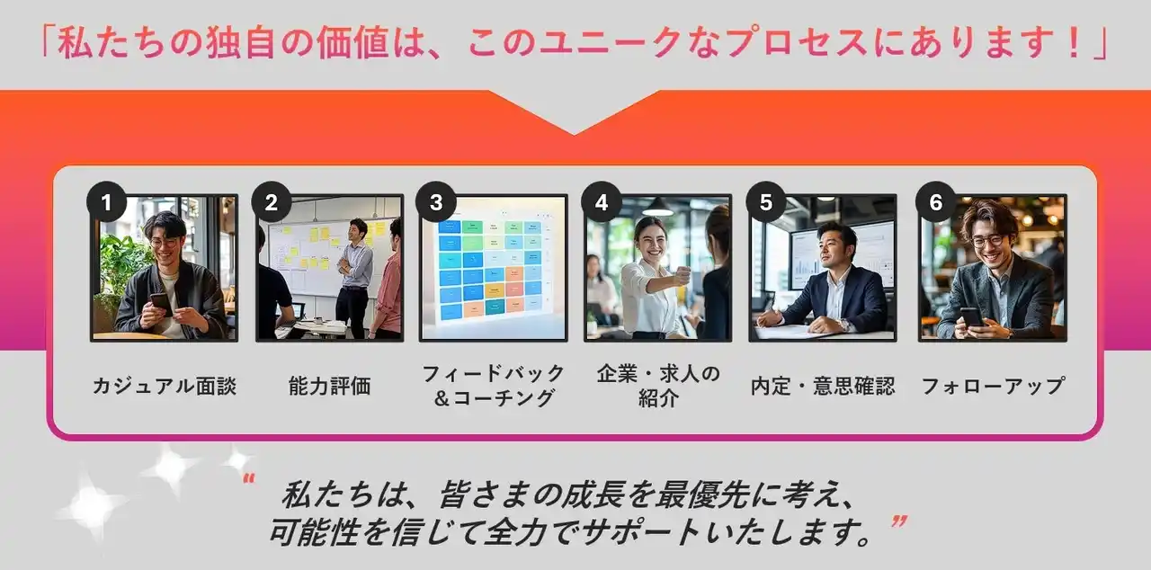独自の候補者アセスメントとメンタリング 約3時間のロールプレイやケーススタディを通じて実務スキルを検証し、強みと改善点を率直にフィードバック。カルチャーフィットやキャリア成長を考慮した提案を行い、入社後もオンボーディング支援やメンタリング・コーチングを提供します。 |