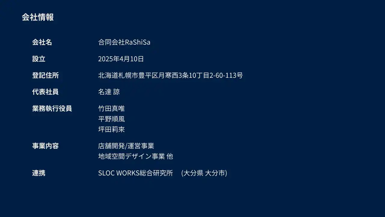 | 2025年4月、喫茶こともしの運営を中心に 店舗開発/運営事業・地域空間デザイン事業の展開を視野に入れた合同会社RaShiSaを設立しました(代表社員:名達諒)。 |