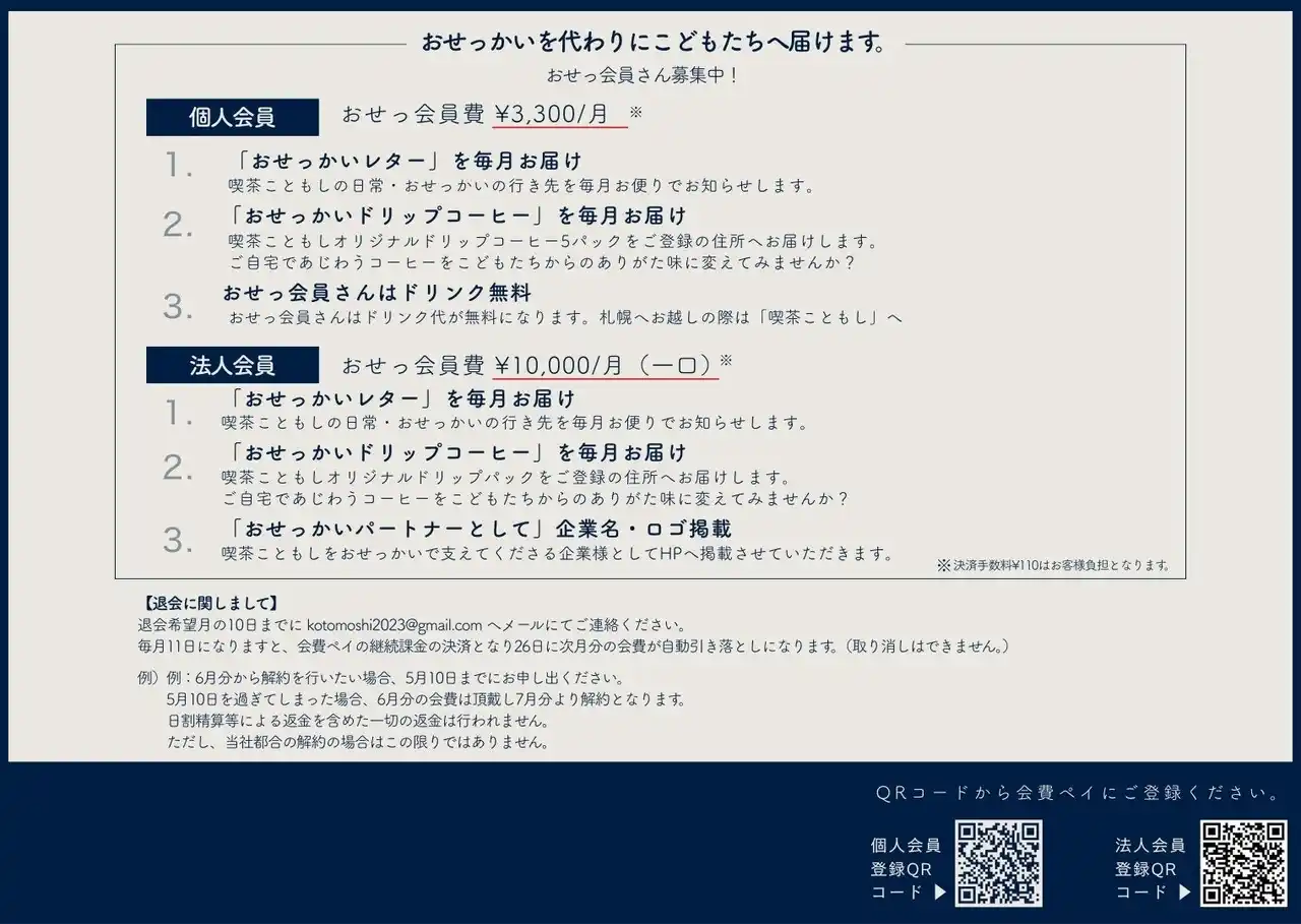 ¥3,300/月でおせっ会員(月額会員)になることができます。 お近くの方であれば「喫茶こともし」ご利用時の1.ドリンク代が無料・2.おせっかいレターのお届け・3.モーニングメニューの割引などの特典がございます。 また、 |