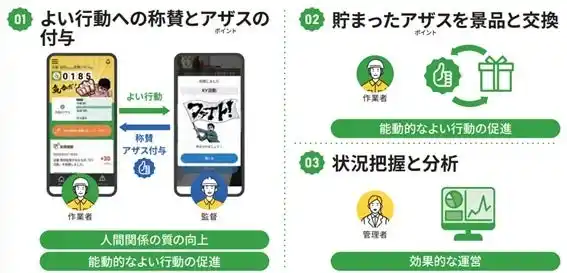 ポイントを送ることで、推奨される行動を啓蒙し、作業員と監督の間の信頼関係を構築、コミュニケーション活性化を通じて作業現場が明るく、安全になっていきます。 |