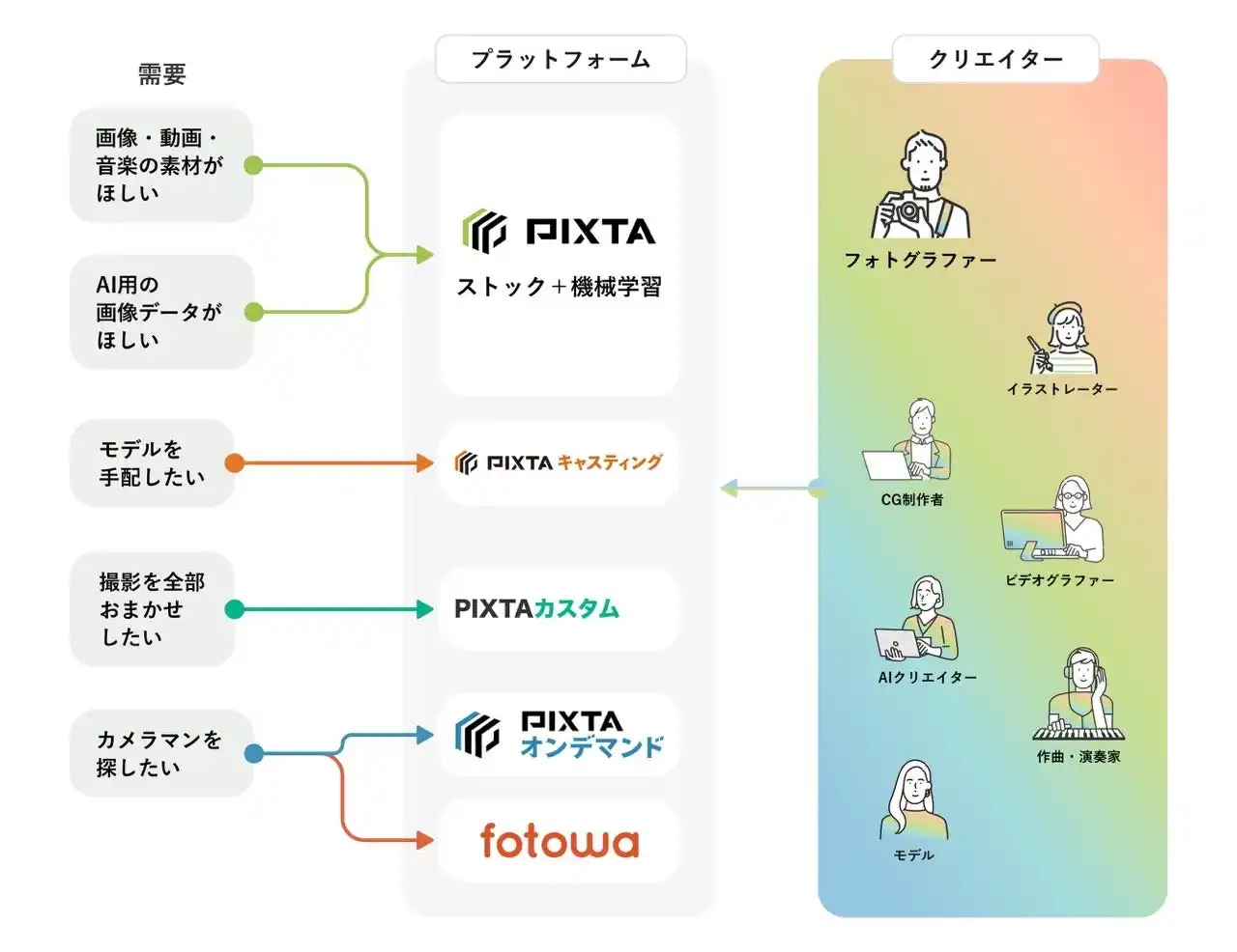 | 事業内容:デジタル素材のオンラインマーケットプレイス「PIXTA」の運営、法人向け出張撮影・カメラマンサービス「PIXTAオンデマンド」の運営、出張撮影プラットフォーム「fotowa」の運営 | ||||||||||||