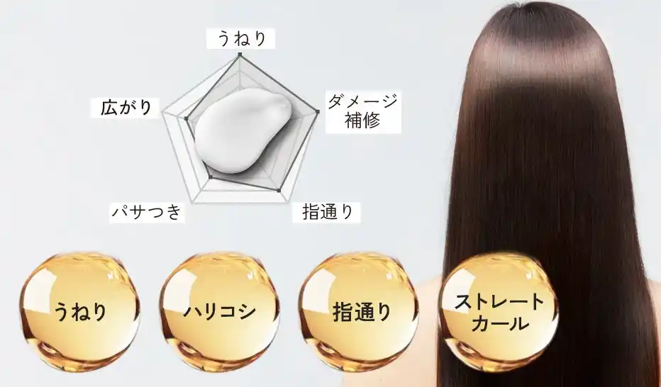 熱に反応する補修成分※5を贅沢に配合。ドライヤーやアイロンの熱を利用して髪の内部にしっかりと浸透し、日々のスタイリングによる熱ダメージをケア 。乾かすだけで、まるでサロン帰りのような仕上がりに導きます。 |