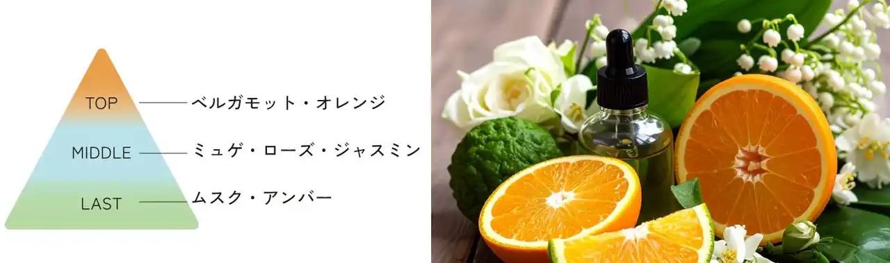 スズランなどのホワイトフローラルを中心に、ベルガモットなどのシトラスを組み合わせた、清潔感のある香り |