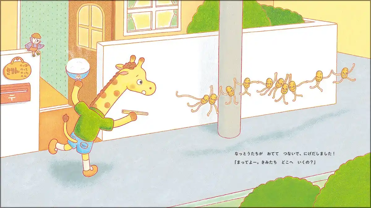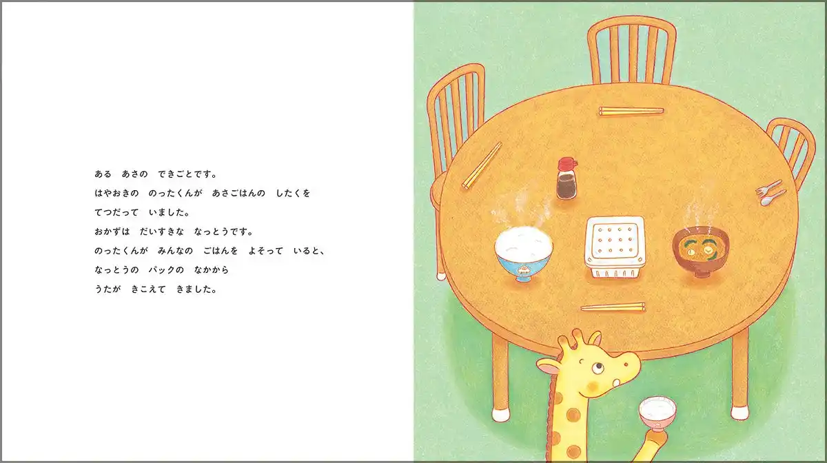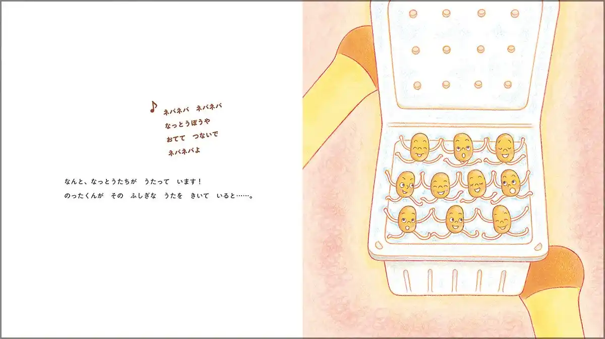 | 納豆を題材にしたのは、ちょうど夫が納豆を食べていたから。また、園児たちが手をつなぐ春の光景と、納豆の糸を引く様子が重なって、自然とこのお話が生まれました。 | |||||||||
