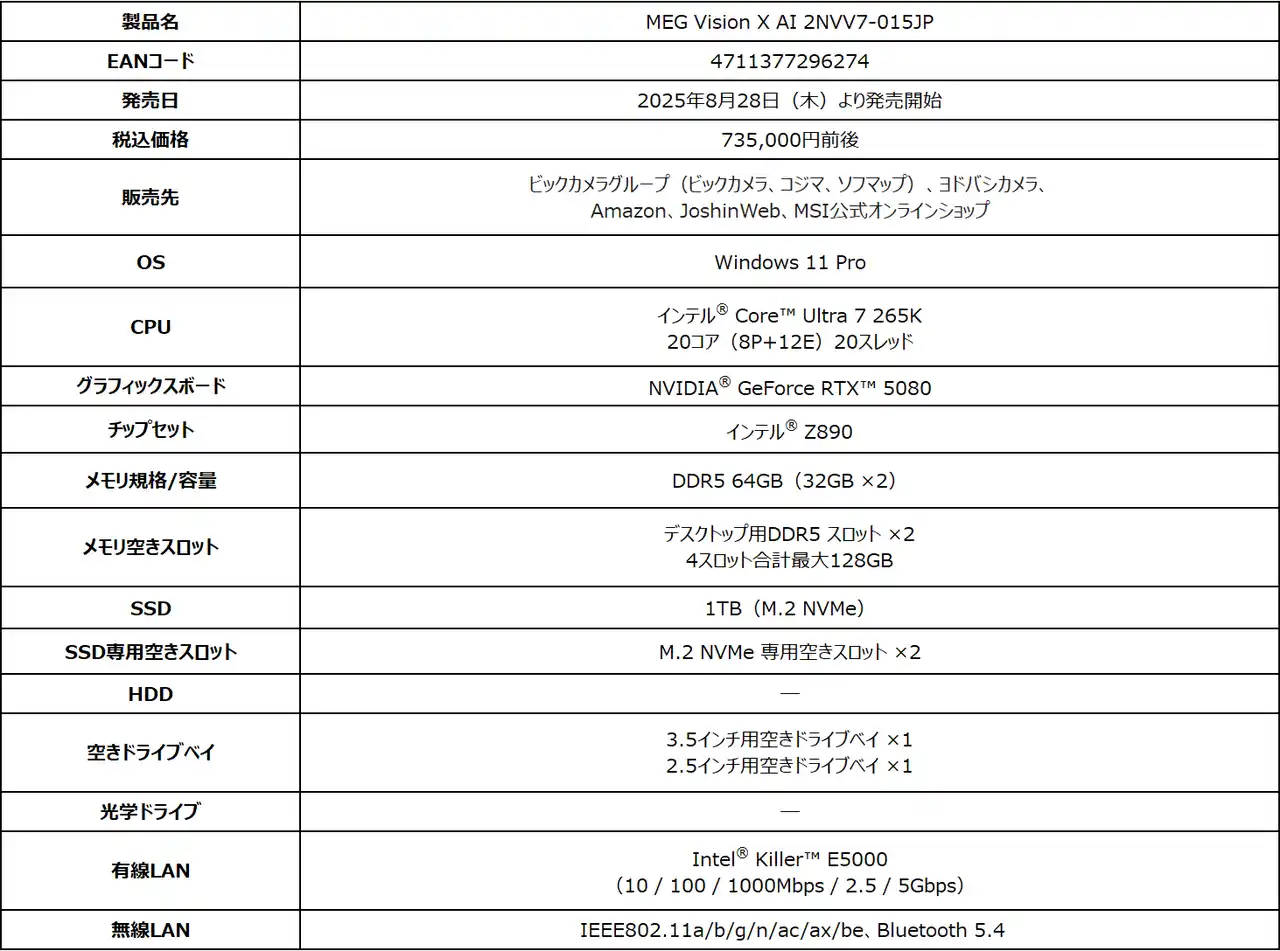 この度、エムエスアイコンピュータージャパン株式会社は2025年8月28日(木)より新たな製品を発売開始します。他の類を見ない革新的な機能を備えたゲーミングデスクトップPCブランド『MEG Vision X AI』シリーズから、フロントパネルにタッチ操作にも対応した13.3インチの液晶モニターを内蔵した「MEG Vision X AI 2NVV7-015JP」、高性能かつ冷却性能に優れたゲーミングデスクトップPCブランド『MPG Infinite X3 AI』シリーズから、「MPG Infinite X3 AI 2NVV7-039JP」、「MPG Infinite X3 AI 2NVR7-091JP」の計3製品を新たにラインナップに追加いたします。 |