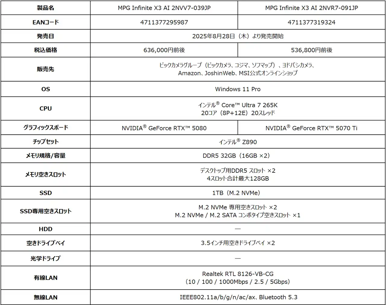 【MPG Infinite X3 AI 2NVV7-039JP / 2NVR7-091JP】 |