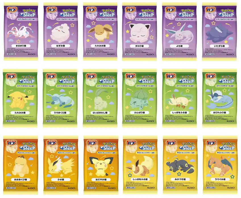 左から『バブ ポケモンスリープ ナチュラルラベンダーの香り』(販売名:バブYd)『バブ ポケモンスリープ スイートカモミールの香り』(販売名:バブYd)『バブ ポケモンスリープ ネロリ(オレンジフラワー)の香り』(販売名:バブYd)いずれも【医薬部外品】 |