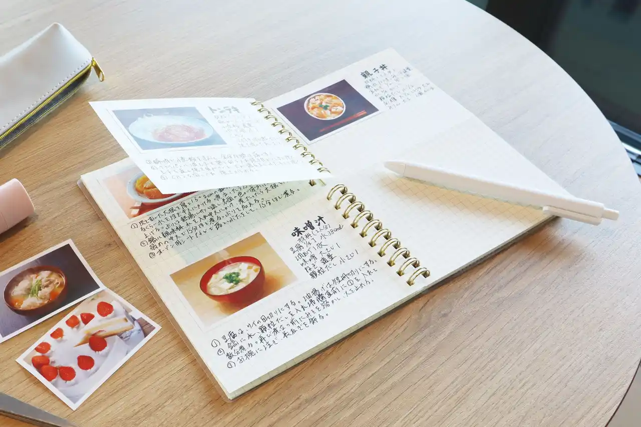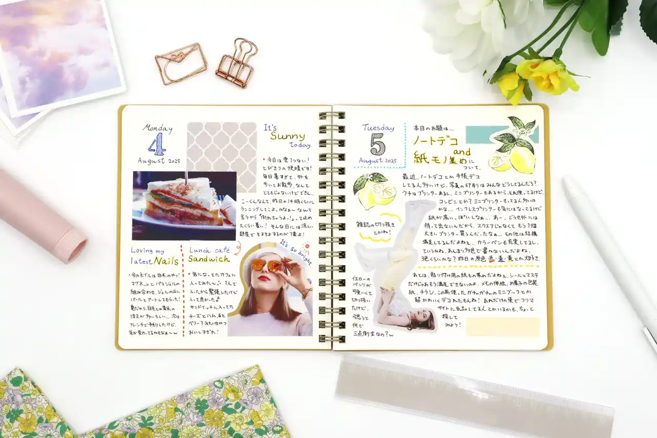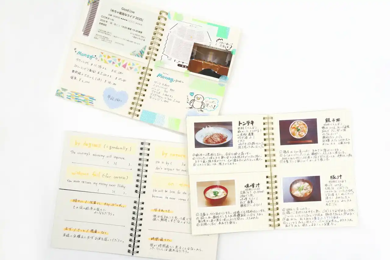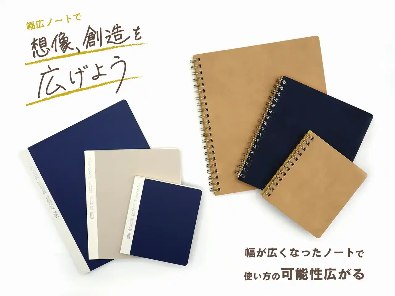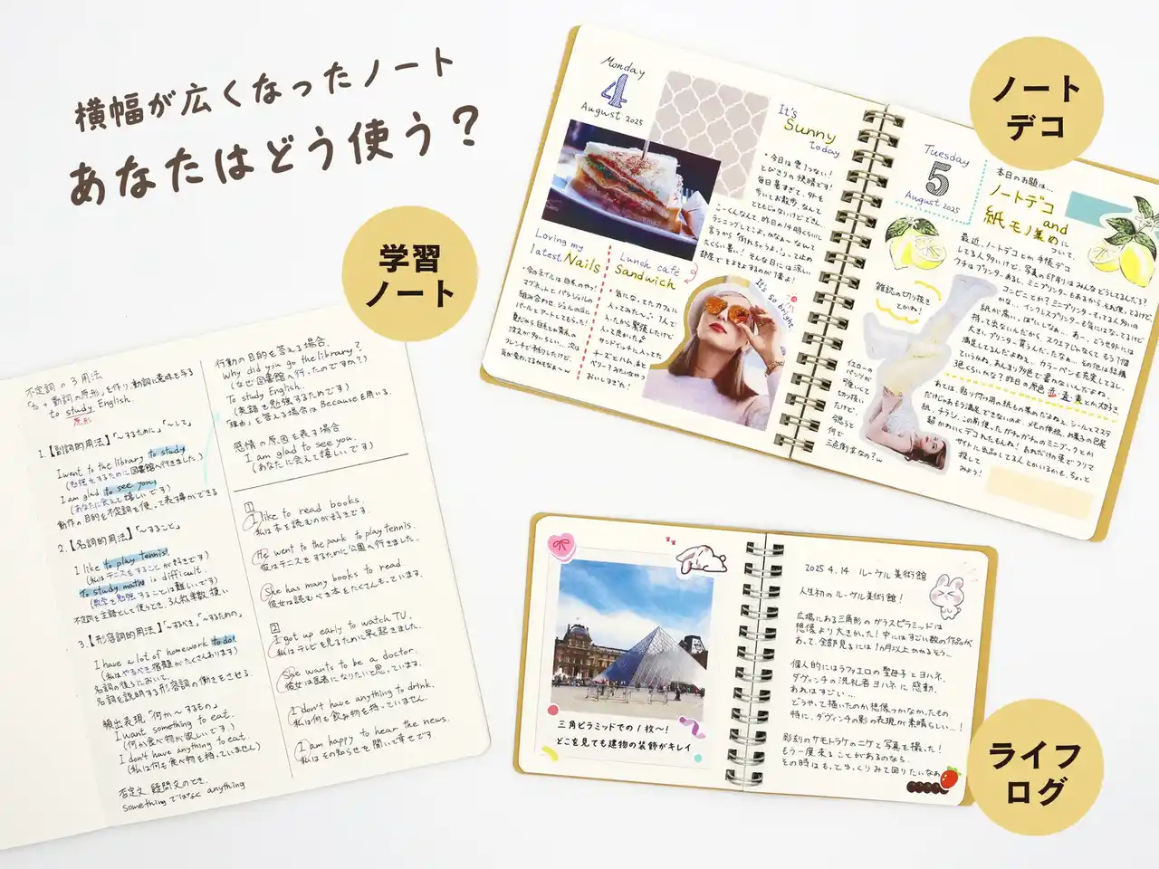 | 横幅を広く設計し写真を貼っても書くスペースを確保、リングタイプ・無線綴じから選べるノート | ||||||||||||
