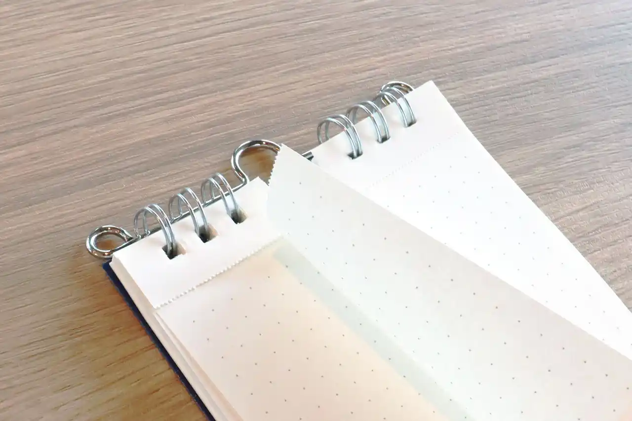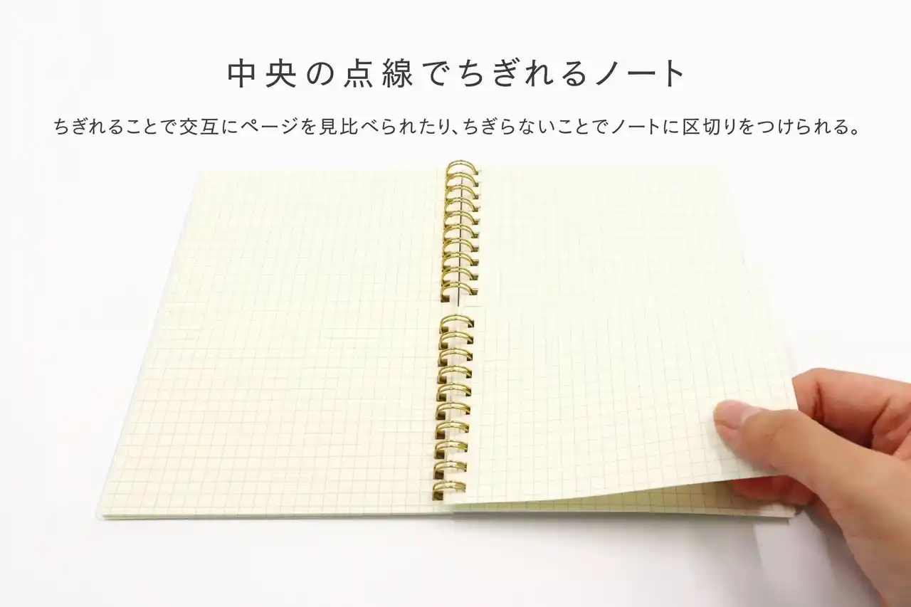 | ページ中央の点線でちぎることで、ページを交互に見比べることができ、ちぎらないページがインデックスのように自然な区切りの役割を果たすノートです。 | ||||||||||||