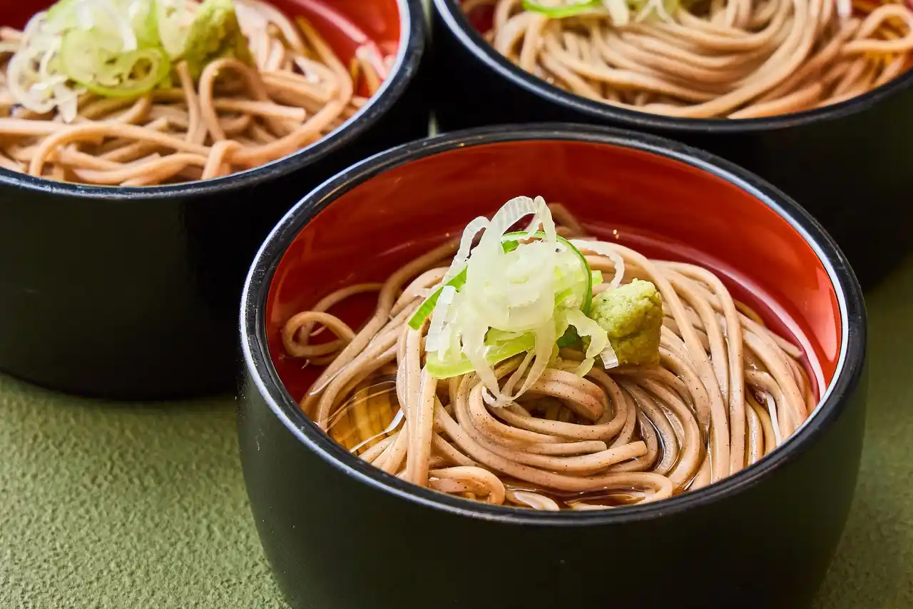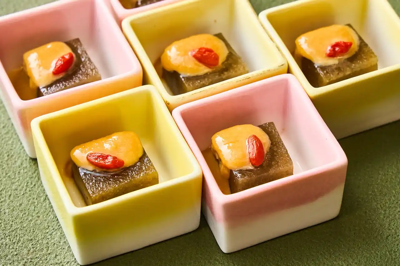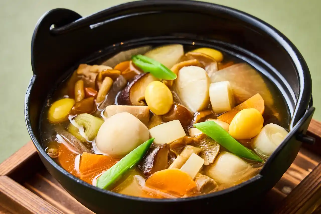 日本料理からは、新潟県の郷土料理「のっぺい汁」をご用意します。里芋や根菜、きのこなどの具材を鶏肉と一緒に煮込んだ汁物です。野菜の優しい甘さが際立つ一品です。お蕎麦は日替わりでご用意いたします。新潟県十日町市の名物である、布海苔をつなぎに使ったつるりとした喉越しで香り高い「十日町そば」、または高冷地の気候と昼夜の寒暖差がある長野県で栽培されたそば粉を使用した風味豊かでコシがある「信州そば」をお楽しみいただけます。新潟県の郷土料理で、海藻の一種であるいご草を煮て冷やし固めた「いごねり」もご賞味ください。ところてんのような食感で、磯の香りが際立つ一品です。 |