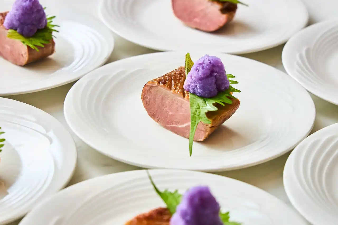 鉄板で香ばしく焼き上げた合鴨は外はカリッと香ばしく、中はふっくらジューシーで口いっぱいに広がる鴨の旨みを、鮮やかな紫色が美しい長野県産紅くるり大根おろしとまろやかな酸味の特選ポン酢醤油が引き立てる一品です。 |