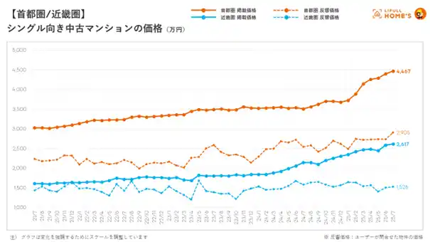 シングル向き中古マンションの平均掲載価格は、首都圏(東京都、神奈川県、埼玉県、千葉県)で4,467万円(前年同月比127.4%)、近畿圏(大阪府、兵庫県、京都府)で2,617万円(前年同月比122.3%)となり、首都圏、近畿圏ともに前月に続いて2021年2月の計測開始以降の過去最高価格を更新しました。 |