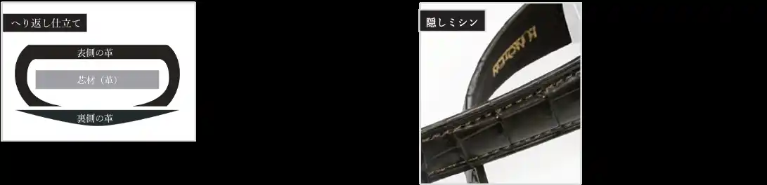 『クニスタイン』が誇る “へり返し仕立て” と “隠しミシン” という匠の技。表革を裏側に巻き込む “へり返し仕立て” は、革ベルトとして最上級の美しさといわれる仕立てです。装飾を削ぎ落とすことで素材の質感を引き立てつつ、装着感に優れた仕上がりを実現。さらに、縫い目を出さない “隠しミシン” は、石国が世界に先駆けて開発した技術。ミニマルな造形美だけでなく、汗の染み込みを抑え、見た目と機能を両立しています。 |