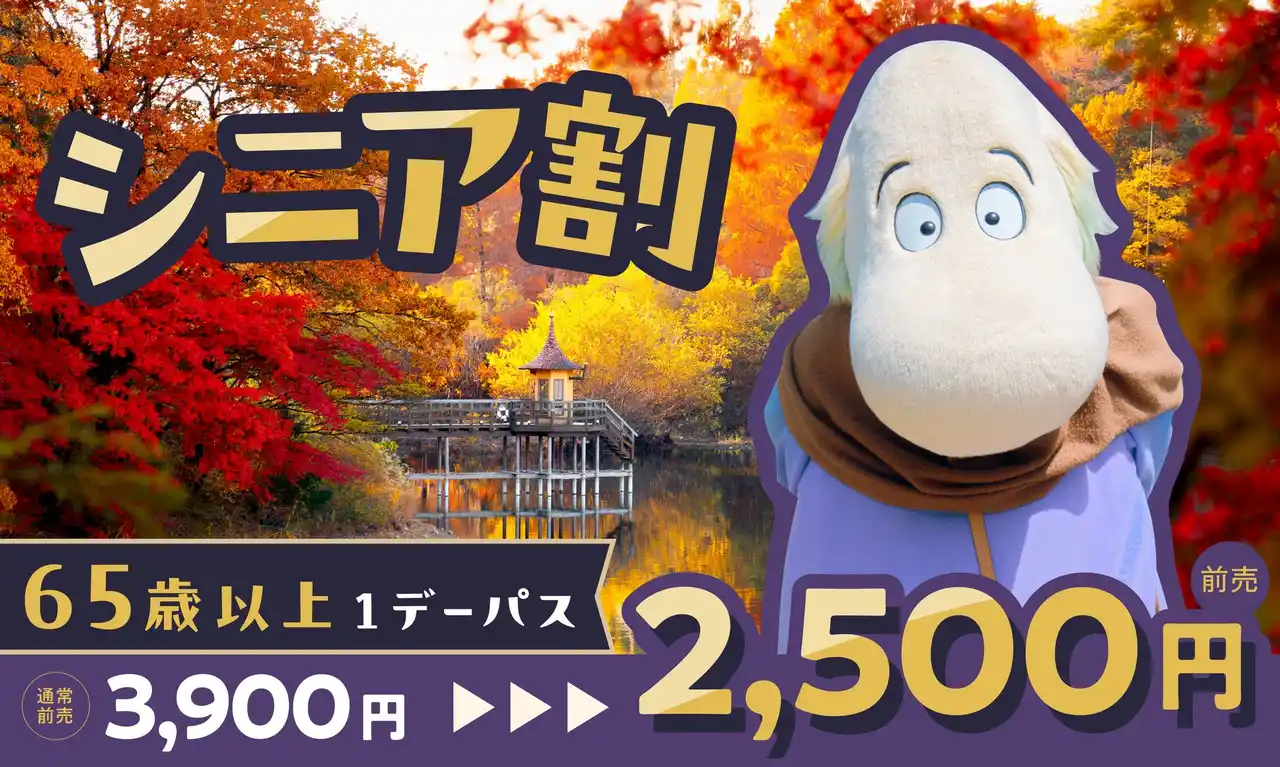 キャンペーン期間中はおとな通常当日4,300円(前売3,900円)のところ、前売りチケットに限り、「シニア割」2,500円の特別価格でご購入いただけます。また、こども1デーパスが500円で購入できる、こども応援キャンペーンも10月31日(金)まで実施しております。ぜひご家族と一緒に、ムーミンバレーパークで過ごす時間をお楽しみください。 |