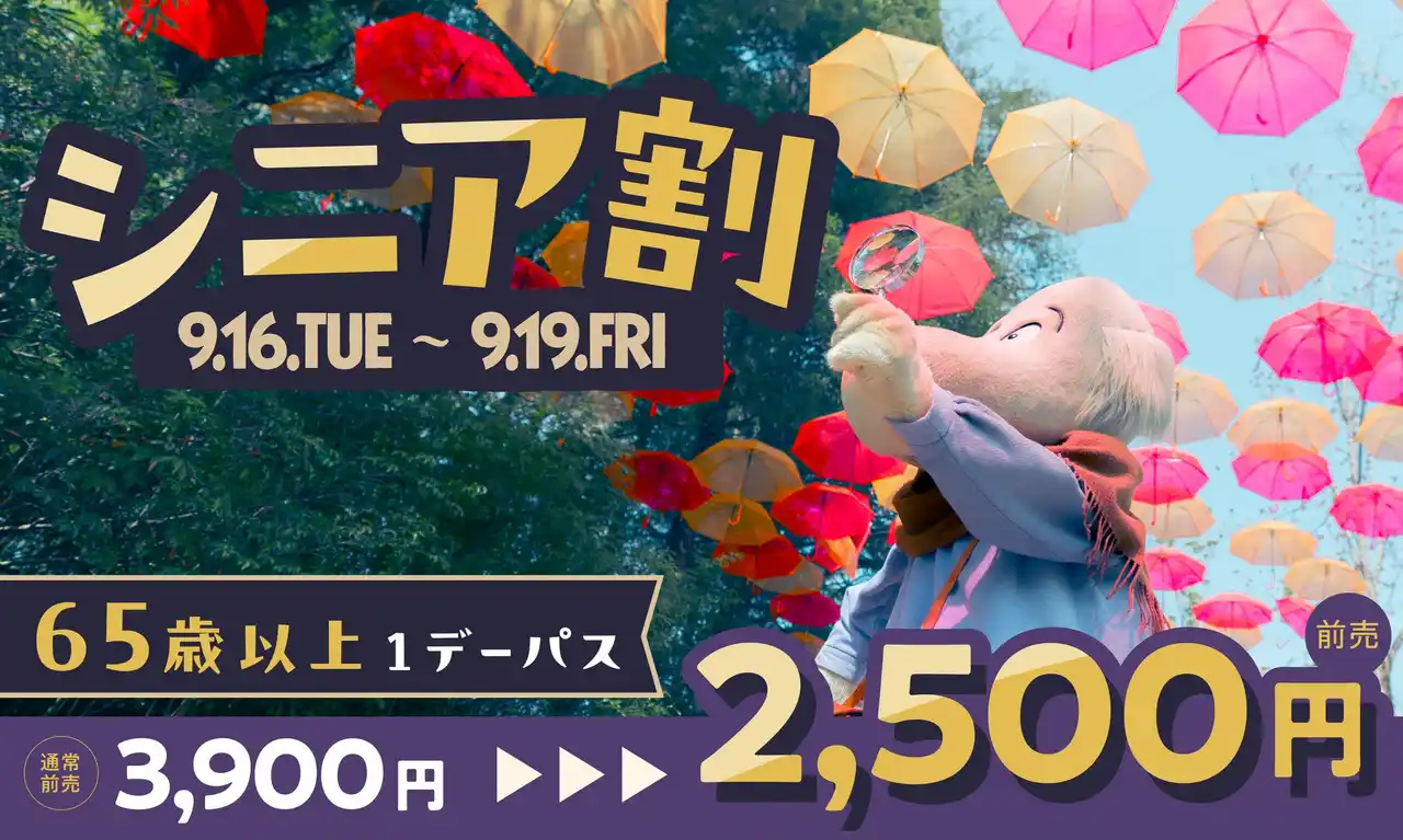 | ▶9月15日(月・祝)敬老の日限定!65歳以上のお客様はムーミンバレーパーク1デーパス無料! | |||||||||||||