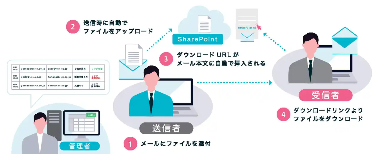 メールの添付ファイルの安全な共有と情報漏洩リスクの低減のため、Microsoft 365連携による |