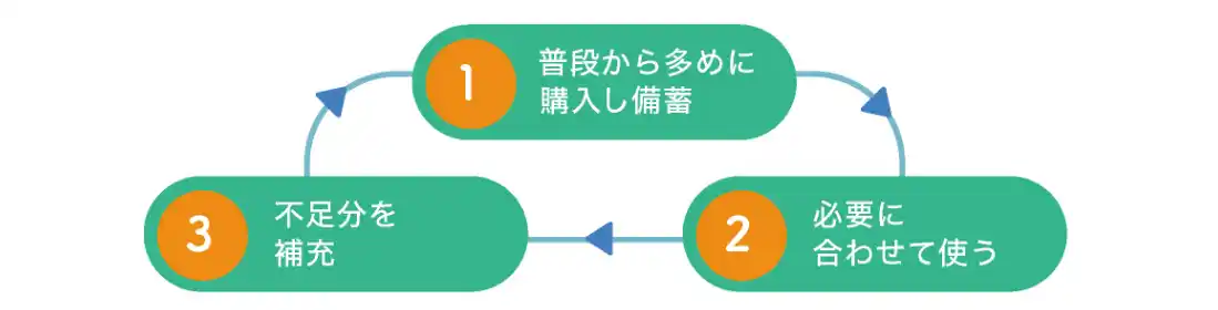 日常生活のなかで備蓄を継続するには、「1.普段から使う」、「2.使ったら買い足す」、「3.常に一定量を備える」という3つのステップを意識し、無理なく習慣化することが大切です。災害時にも使い慣れた日用品を手元に置いておける環境づくりが、生活者の安心につながります。 |